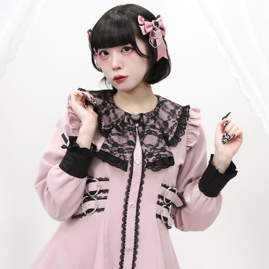 リボン襟にはレースが重なって上品でかわいいデザインがポイントです。