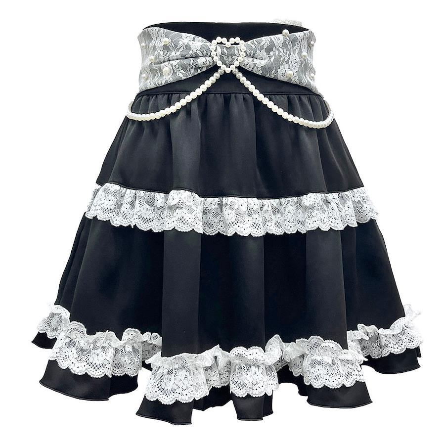 リボンパールチェーンレースフリルスカート♪【デザイン】ウエスト部分の大きいレースパールリボンがポイントになりますバックルもかわいいハートパールバックルになっていますパールチェーンがかわいさ激増ティアードスカート風になっていて、レースフリルがたっぷりなのもかわいい後ろファスナーにもハートパールチャームが付いています。【素材】しっかりとした素材になっています。本体に裏地付き、後ファスナー、ウエストゴム付きです。【コーディネート】甘めブラウスに合わせるのがオススメ量産型のコーデにピッタリのアイテムです。《透け感》なし 《生地の厚さ》普通 《裏地》あり《生産国》中国