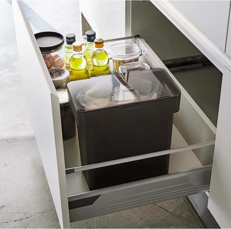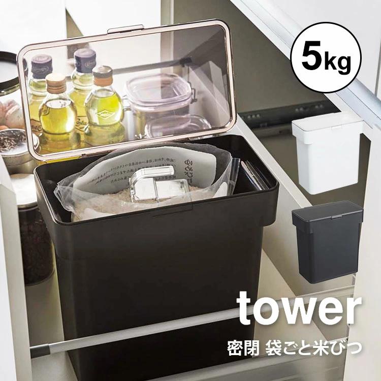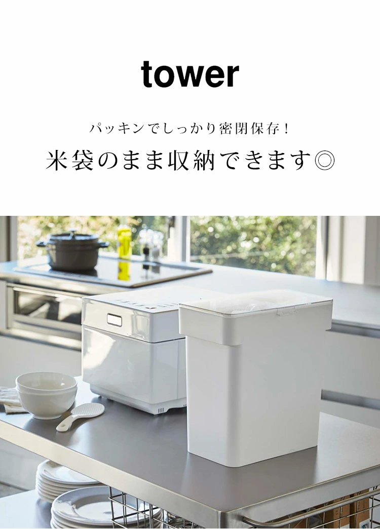 【密閉袋ごと米びつ】キッチンの引き出しにキレイにしまえるように設計されたtowerの密閉シンク下米びつ。パッキンでしっかり密閉されるのでお米の湿気と酸化を防いでくれます。底のカタチが付属の計量カップにピッタリとフィットするので、残りのお米をきれいにすくい取れます。