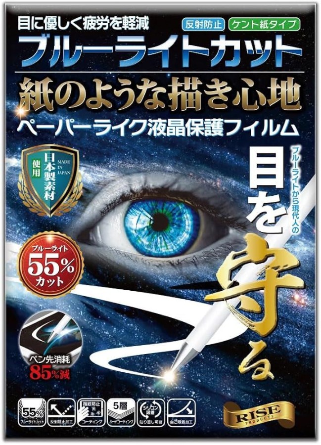 ブルーライトを最大55%までカットするペーパーライクフィルム素材を使用、カット率で目の負担を軽減し、目を優しく守ります。