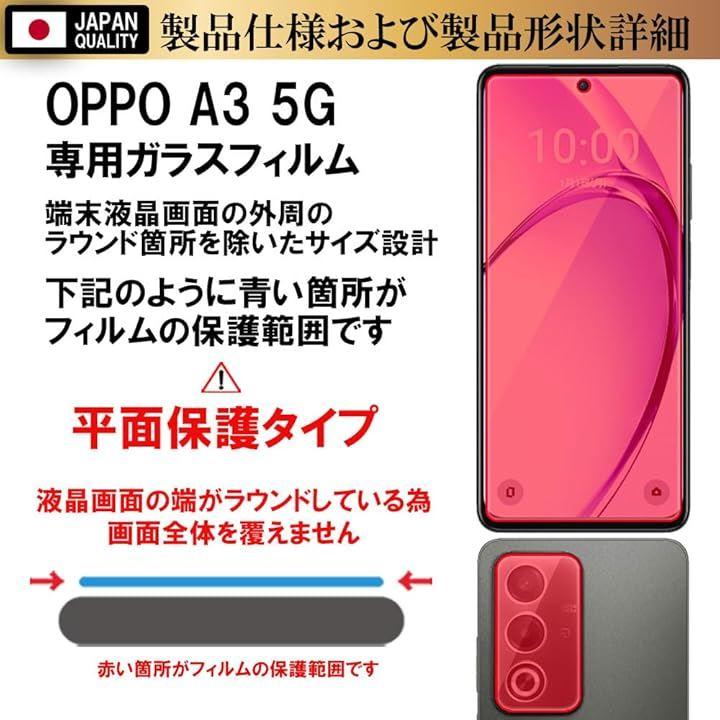 対応機種及び仕様OPPO A3 5G クリアガラスフィルム2枚+クリアカメラレンズ保護ガラスフィルム2枚セット。