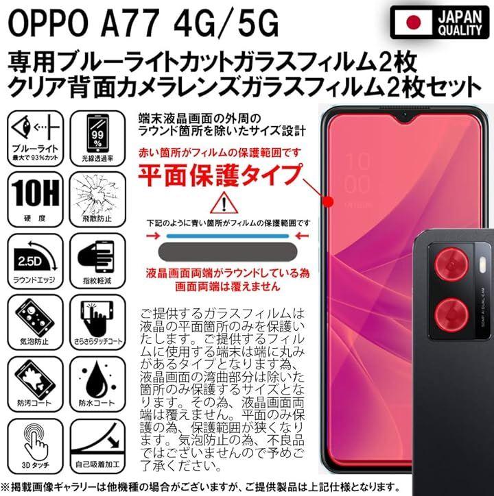 「対応機種及び仕様」OPPO A77 4G ブルーライトカットガラスフィルム2枚+クリアカメラレンズ保護ガラスフィルム2枚セット。