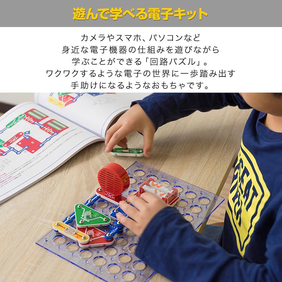サイズ 取り付けプレート:(約)幅28cm×奥行19.5cm パッケージ:(約)幅48cm×奥行34cm×高さ5.5cm 重量 (約)1700g ※パッケージ含む 対象年齢 8歳以上 材質 ABS樹脂 / 銅 使用電池 単3形アルカリ乾電池×4本(別売り) こちらの回路パズルは完全に安全なものであり使用も簡単です。ただし、パーツの損傷を最小限に抑え良好な状態を維持するために、次の簡単なルールを遵守してください。 ●正しい極性(+/-)を使用してください。 ●パーツをコンセントに接続しないでください。 ●組み立てた電子回路が組立図と完全に一致していることを確認してください。 ●パーツを取り付ける時はパーツの中心部ではなくスナップボタンを押してください。 ●回転するプロペラに触れたり、物を近づけないでください。 ●すべての接続パーツが安全に組み立てられたか確認してください。 ●回路のいずれかのパーツが過熱し始めた場合は、ただちにバッテリーを取り外してください。 ●絶対に電池をショートさせないでください。 ※商品は、モニターによって色合いが異なって見える場合があります。 ※仕様・デザインは改良のため予告なく変更することがあります。