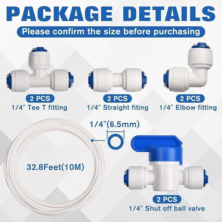 パッケージに含まれるもの:2個1/4インチODインラインシャットオフボールバルブ、2個1/4インチODユニオンストレートスルーコネクタ、2個1/4インチODユニオンエルボーコネクタ、2個1/4インチODユニオンティーコネクタ、32.8フィートのウォーターチューブ