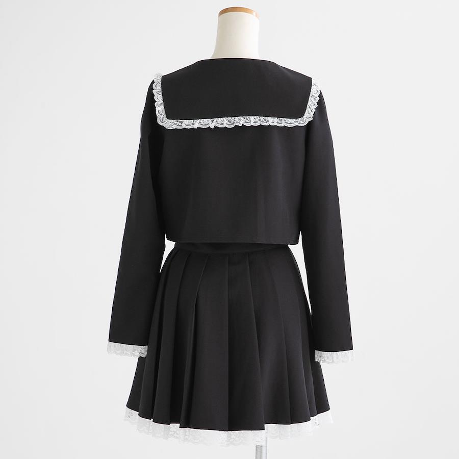 襟や袖口、胸ポケット、スカ―ト裾等レースをふんだんに使用しており、写真映え間違いなしのデザインに♪