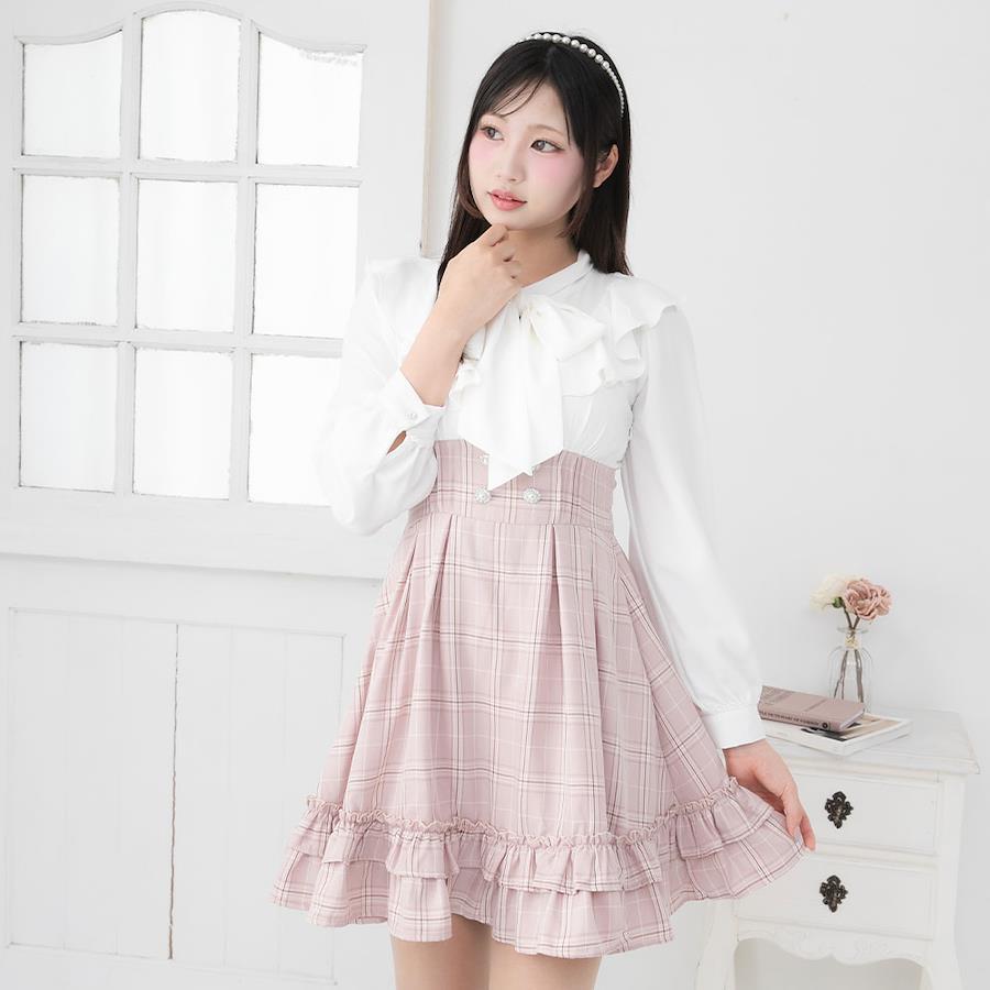 チェックスカートとボウタイブラウスをドッキングした、1枚でコーデが完成するワンピースです。