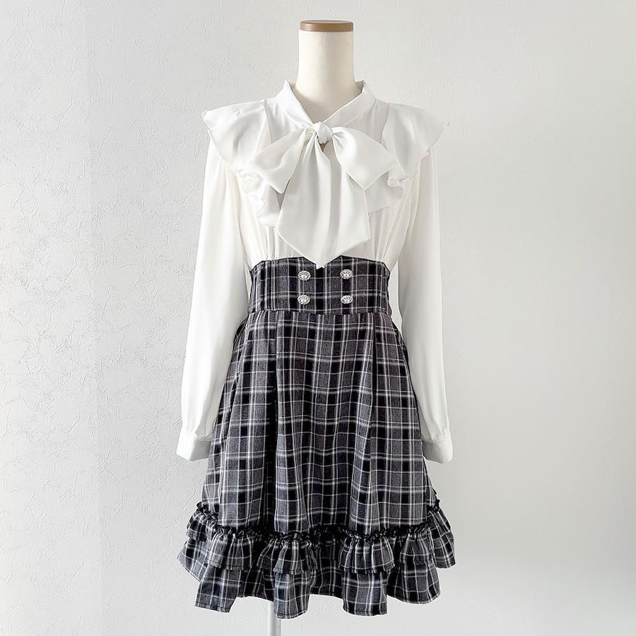 チェックスカートとボウタイブラウスをドッキングした、1枚でコーデが完成するワンピースです。