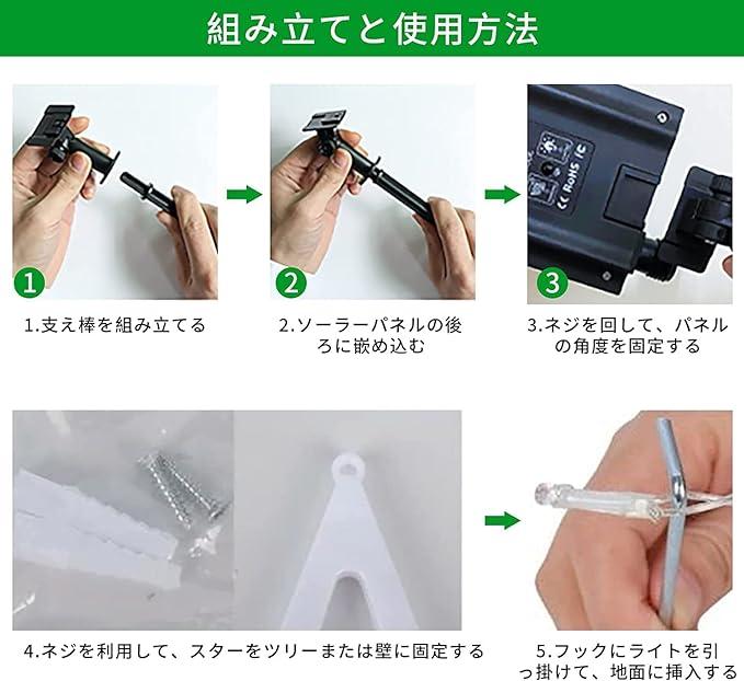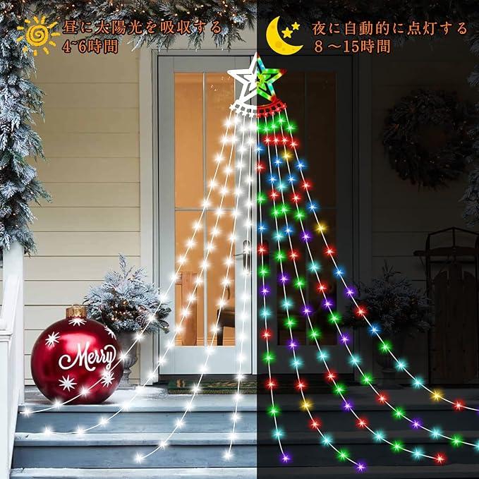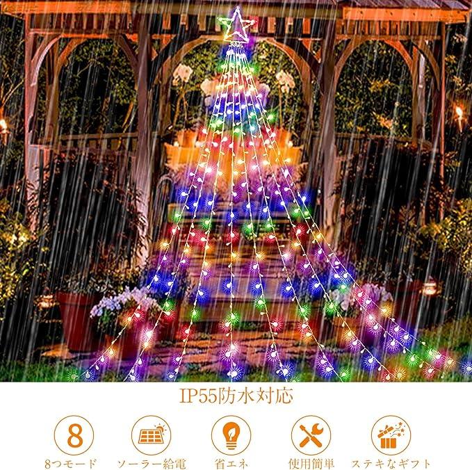 ■商品説明??【ソーラー式のLEDライト】電気代0円!このクリスマス飾りライトはソーラーエネルギーで充電なので、昼間はソーラーパネルが自動充電し、太陽エネルギーを電気に変換して、省エネの上に環境に優しく、電気代0円です!電源場所を気にせず屋外と室内共設置や移動が可能です。パーティー、結婚式、ショッピングモール、ハロウィン、クリスマス、ガーデン、キャンプ、ホテル、バー、店舗、寝室、玄関、庭、壁、舞台、学校、披露宴ツリーなどの装飾としては大活躍です!??【リモコン操作可能】電源ON/OFF、点灯パターンの変更(8点灯種類:連続変更、波状変更、点滅変更、ちらつき変更、急速変更、低速変更、ドリーム変更、固定点灯)、光量調整、消灯タイマー設定。リモコンの最大制御距離:直線約10m、普通は約5mです。このソーラー ライトはロマンチックかつ癒しの雰囲気を作り出できます。??【屋外使用可能】このLEDイルミネーションライトは防水防塵設計を採用され、水に濡れても心配することがありませんから、天候を気にすることなく様々な場所に取り付けられます。野外でも安心して使えます。また、店舗や商店街といった商業施設だけでなく、学校や幼稚園とご利用をいただけます。??【デザイン】星とイルミネーションの人気の組み合わせて、木のてっぺんのストリングライトを吊るして、カーテンやお部屋、窓などに飾ることができます。ソーラー式のライトが高輝度350LED球を採用、9つのストリングライトを地面に垂らします。(ライトのストリングごとに 3.5 m、36LED球)流れ星のように横に吊るすこともできます。これは理想的な屋外の屋内装飾です。??【ソーラーイルミネーションライトの保障】 購入日から一ヶ月以内に、製品自身に何か問題がありましたら、無料交換と返金のサービスを提供します。商品には何か問題がございましたら、メールでお問い合わせてください。?もっと見る