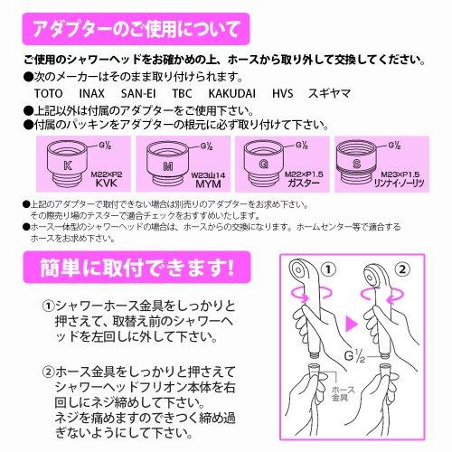 ※本製品に付属しているアダプターで取付できない場合には、適合する市販のアダプターをお求めください。 ※ホース一体型のシャワーヘッドをご使用の場合は、ホースの交換が必要です。 ※水道基準に適した水道水をご使用下さい。 ※シャワーヘッド本体に強い衝撃をあたえると破損します。また、分解、改造等は絶対にしないでください。 ※本製品の仕様は、改良のために予告なく変更することがありますので、予めご了承ください。 ※給湯器の能力・水圧などの条件により、本製品を使用中に湯温が変化する等、正常に機能しないことがあります。 ※水道管が古い場合等ではシャワーヘッド内に赤錆がつくことがあります。(メーカーにて有償で洗浄してもらえます) ※フリオンスマイルの対応水圧は0.1~0.5MPaです。セラミックの抵抗により水流がやや弱まりますのでご注意ください。 ※ご家庭用商品です。業務用にご利用の場合は保証条件等が異なりますので、別途お問い合
