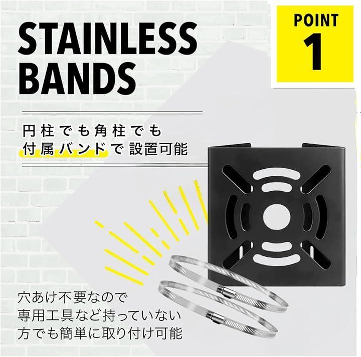 「穴あけ不要で簡単取付」ステンレスバンドを手すりやフェンス、柱やパイプなどの支柱に締め付けて固定するセットになるので、穴をあけずに設置可能。