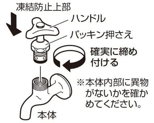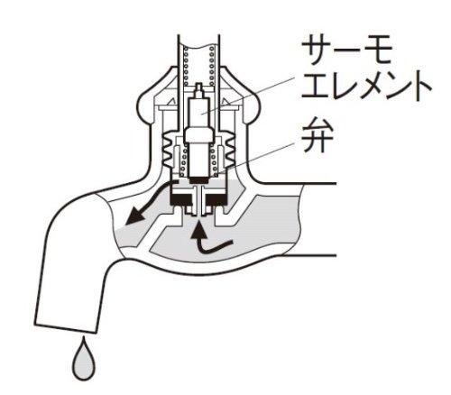 凍結防止用の水栓上部 BR 蛇口の本体内が凍結しそうな温度(約1.7℃以下)になると、サーモエレメントの働きで弁が自動的に開き、少量の水を通水して凍結を防止 BR JIS規格および同等品に適合
