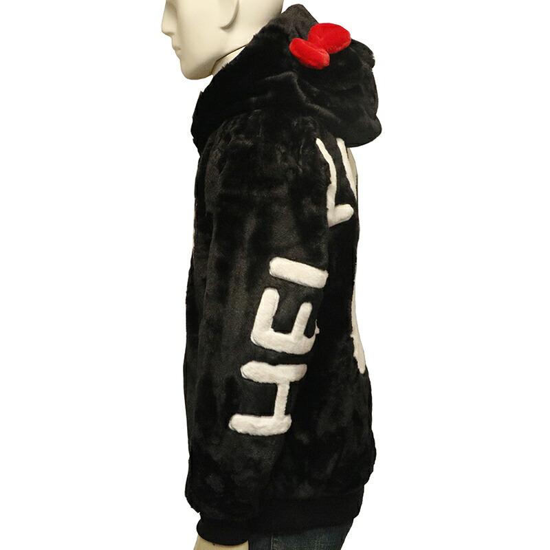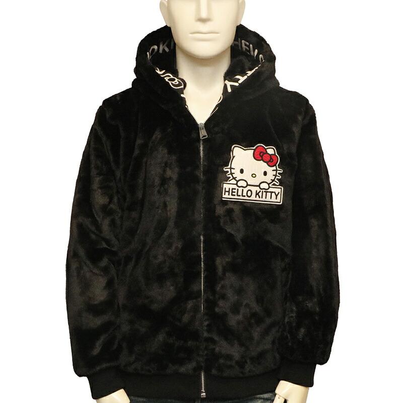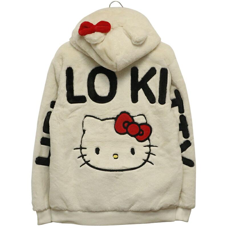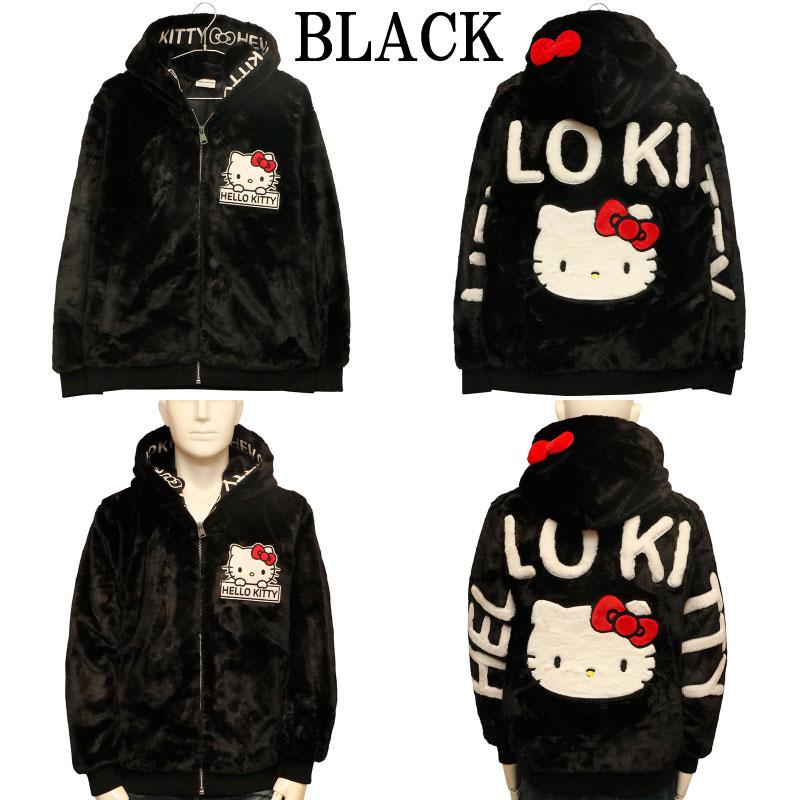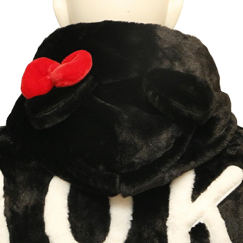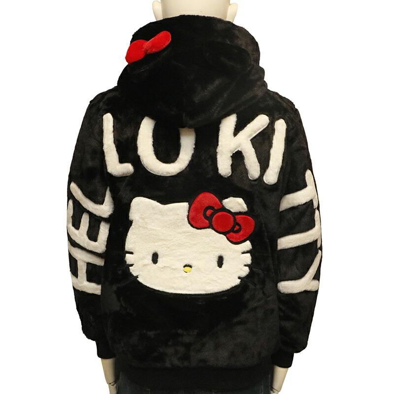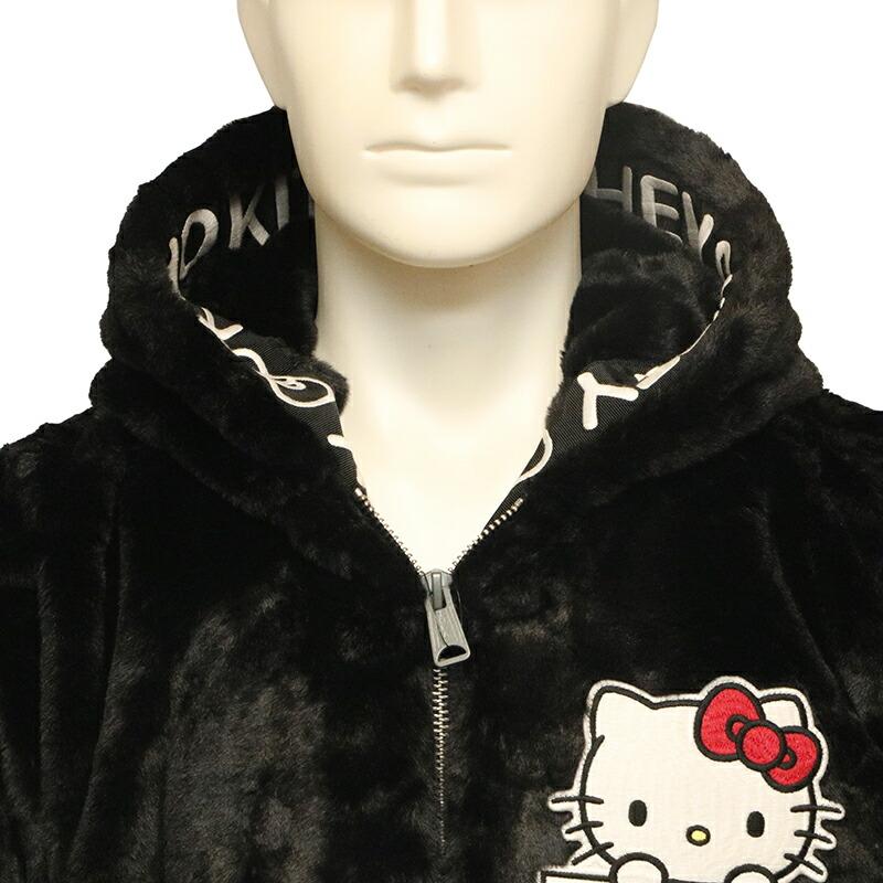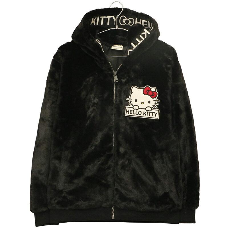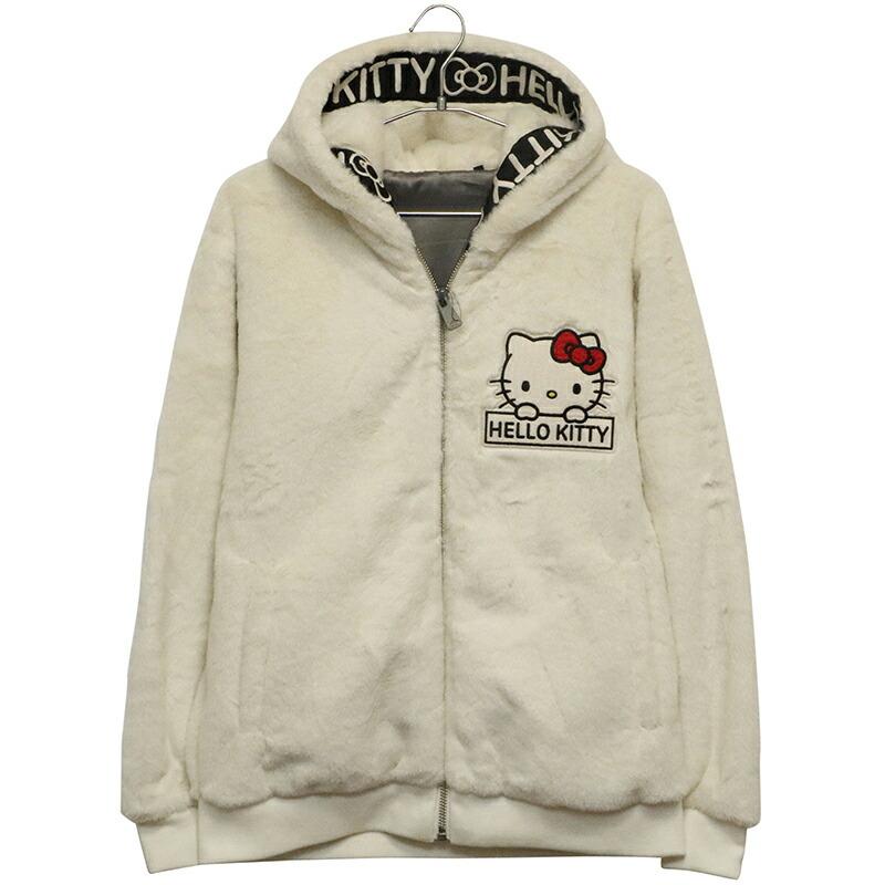 背面にハローキティをファーワッペンで配置し、両袖から背面にかけては「HRLLO KITTY」ロゴを組み合わせ配置。