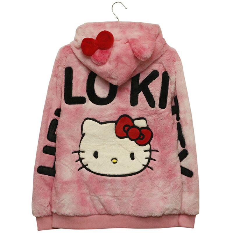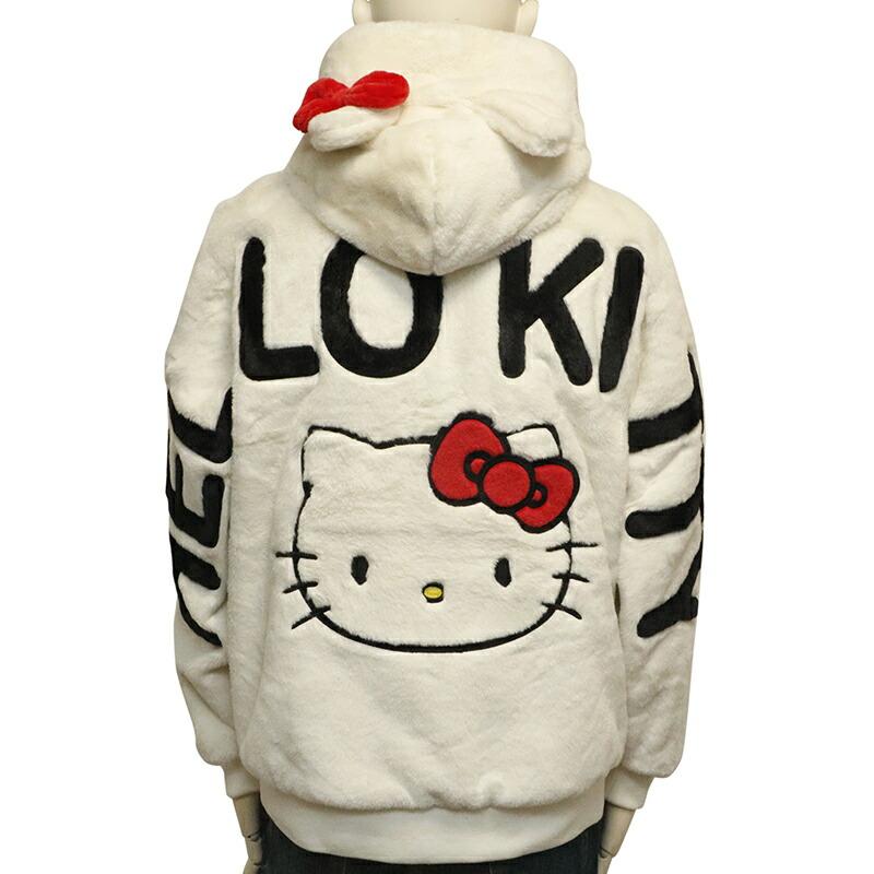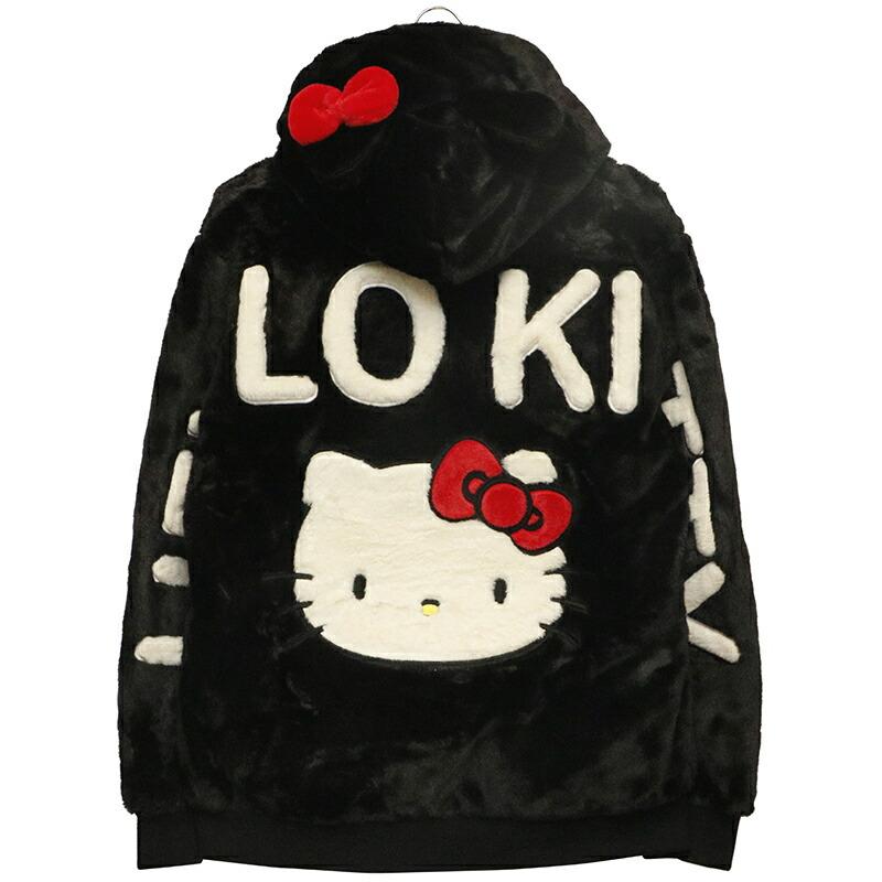 背面にハローキティをファーワッペンで配置し、両袖から背面にかけては「HRLLO KITTY」ロゴを組み合わせ配置。
