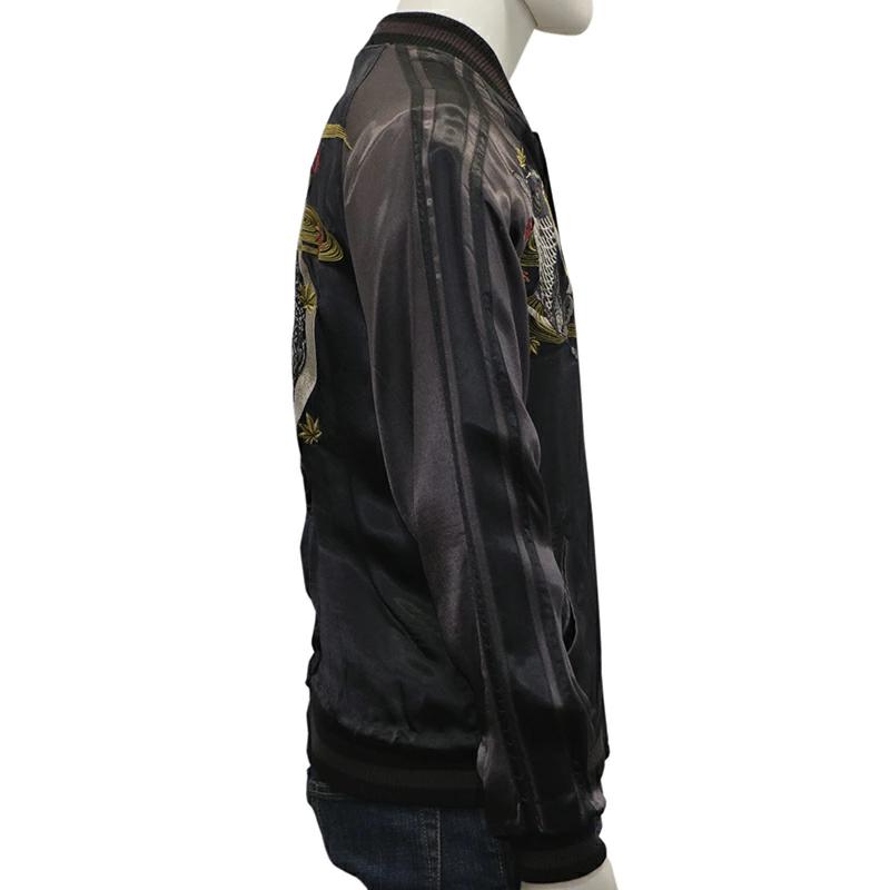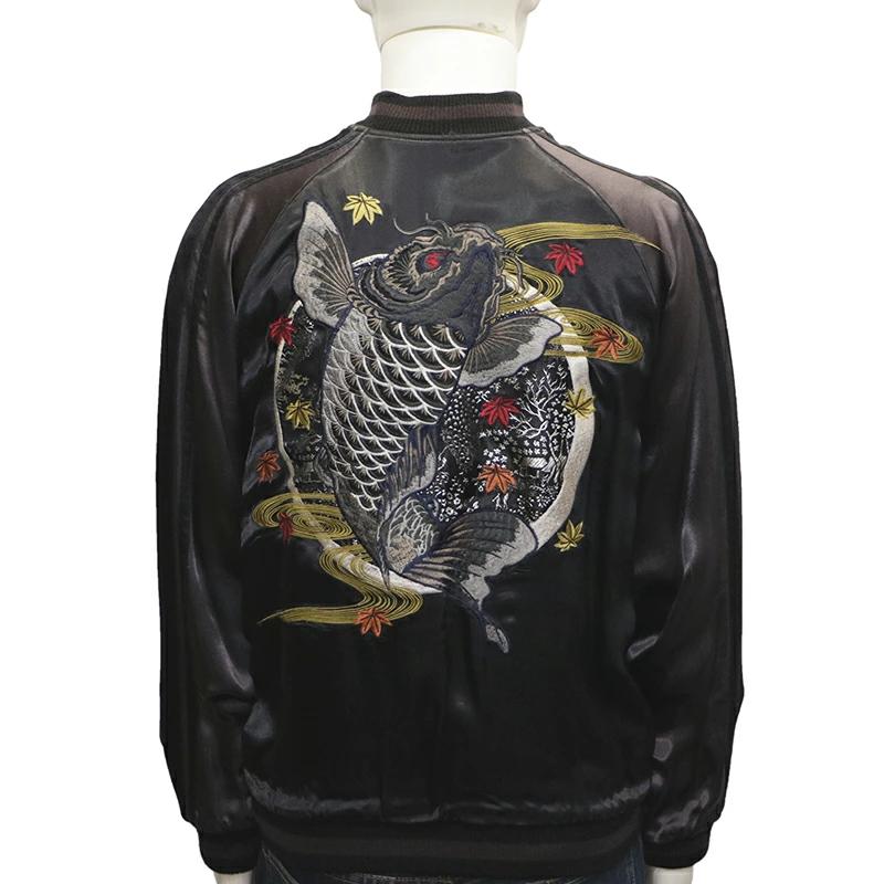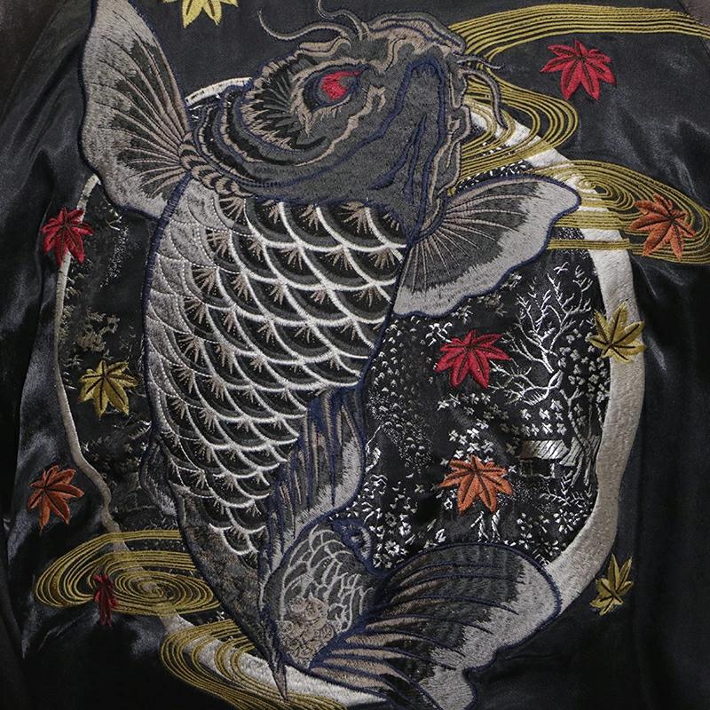 秋の夜空を背景に鯉が高く跳ね上がっているような構図が目を惹くスカジャンです。