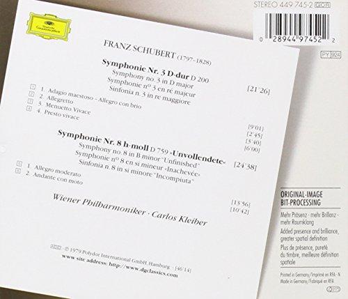 カルロス・クライバーのレコーディングというのはきわめてめずらしい出来事なので、ほとんどの場合、待つ価値がある。この「未完成」の演奏は模範的である――直截(ちょくせつ)で、飾り気がなく、演奏振りはすばらしく、集中力も途切れない。ウィーン・フィルハーモニー管弦楽団がこのプロセスに熱意をもって参加することにまったく問題はなく、彼らのいつもの温か味と持ち前の様式感覚が生かされている。とても心地のよい交響曲第3番では、物議をかもすほどの速いスピードでビュンビュン飛ばす第2楽章があって、楽しい練習に出かけるような気にさせてくれる。手ごろな価格で再発売されたこのディスクは優れた価値があり、とりわけ「未完成」を大作として扱っているところがすばらしい。クライバーが示すとおり、これは注目に値する。