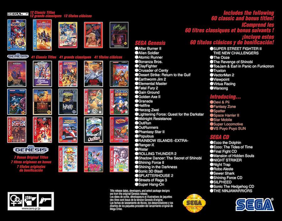 日本版とは一部異なる60タイトルものゲームソフトを収録!日本版メガドライブミニ2とは一部異なる60タイトルのゲームを収録。内訳はメガドライブ/Genesis用タイトルが41本、メガCD/SEGA-CDタイトルが12本、新作のオマケタイトルが7タイトルです。