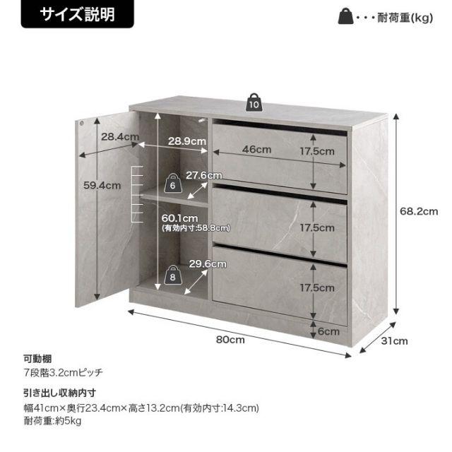 〈製品規格〉【商品サイズ】W80cm×D31cm×H68.2cm【商品重量】約26kg【耐荷重】天板:約10kg、引き出し:約5kg、可動棚:約6kg、扉収納内底板:約8kg【素材・成分】パーティクルボード(メラミン貼り)、キャスター(プラスチック)【組立】要組立品※組み立て時間:2人以上で約80分※プラスドライバーをご用意ください。【生産地】中国