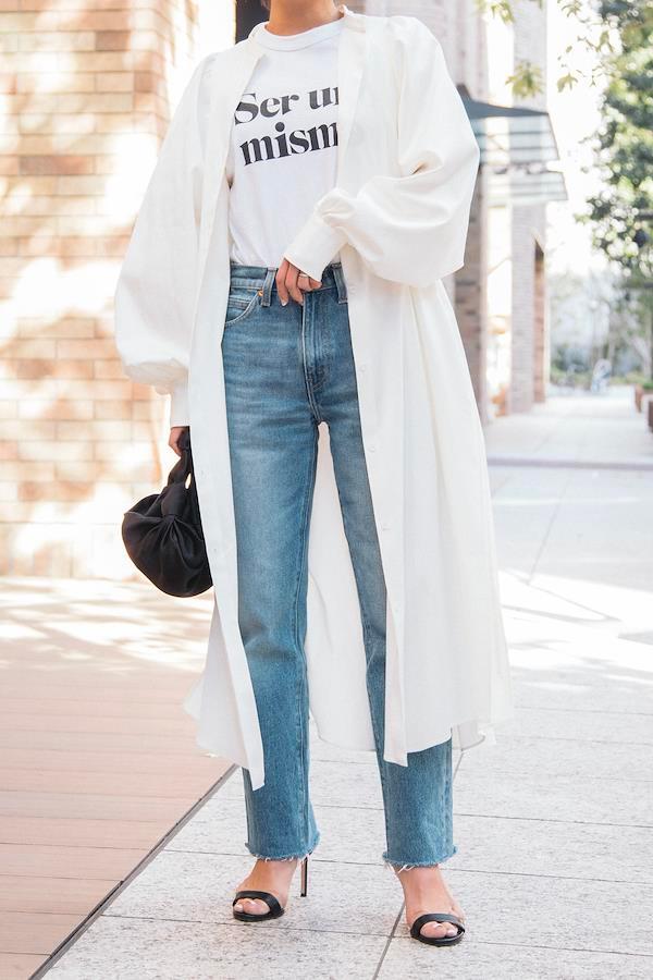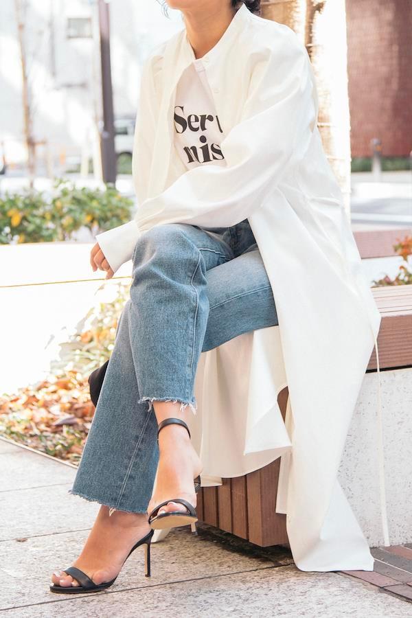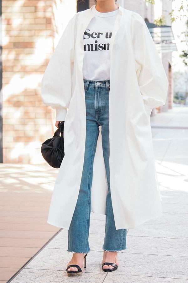 肩から袖にかけてのボリュームと肩幅の切替を内側にすることによってスッキリ見せながらも存在感のあるワンピース。前ボタンを外し、サラッと羽織りとして、ベルトループでウエストを絞ってメリハリのある着方もでき3Wayのスタイルが完成します。