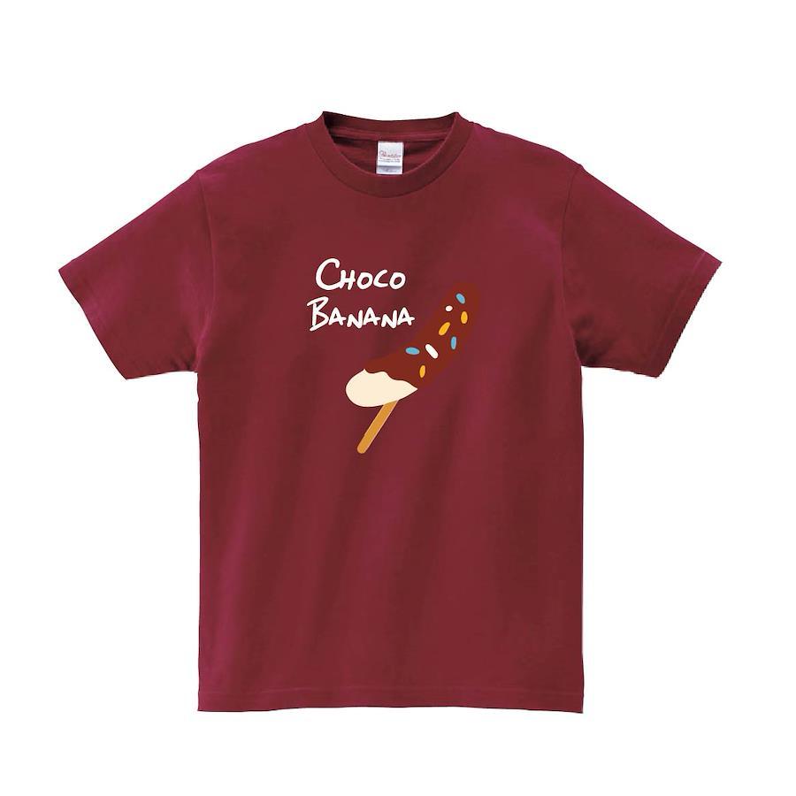 チョコバナナのポップなイラストデザインTシャツです。※画像ははめ込み画像となり、実際とは多少異なりますので予めご了承ください。 ※サイズ表をよくご確認の上ご購入ください。 ※受注生産となるため、返品、交換はご遠慮ください。