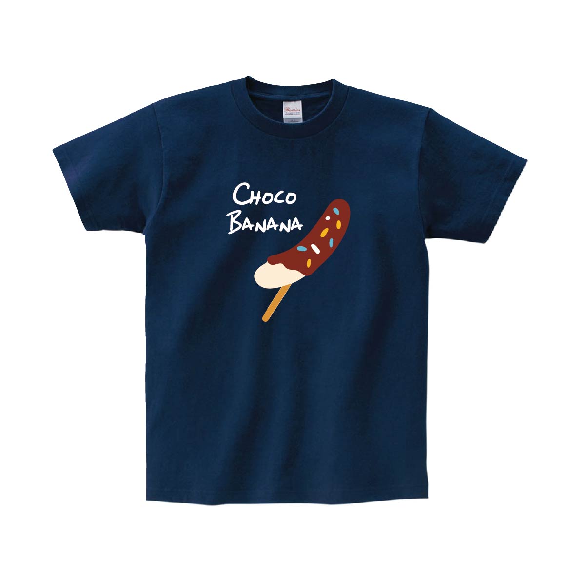 チョコバナナのポップなイラストデザインTシャツです。※画像ははめ込み画像となり、実際とは多少異なりますので予めご了承ください。 ※サイズ表をよくご確認の上ご購入ください。 ※受注生産となるため、返品、交換はご遠慮ください。