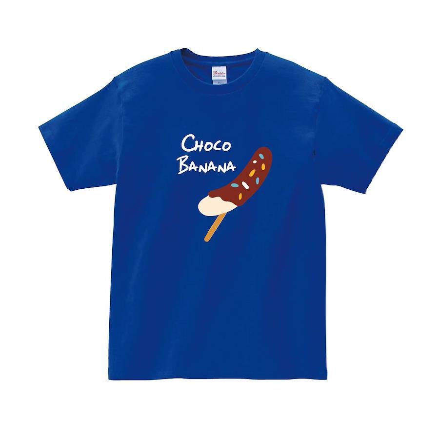 チョコバナナのポップなイラストデザインTシャツです。※画像ははめ込み画像となり、実際とは多少異なりますので予めご了承ください。 ※サイズ表をよくご確認の上ご購入ください。 ※受注生産となるため、返品、交換はご遠慮ください。