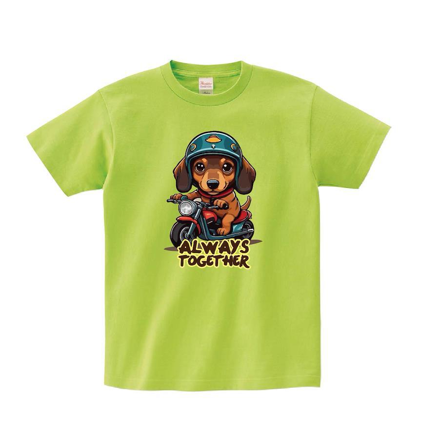 ダックスフントのバイク乗りのかわいいデザインTシャツです。※画像ははめ込み画像となり、実際とは多少異なりますので予めご了承ください。 ※サイズ表をよくご確認の上ご購入ください。 ※受注生産となるため、返品、交換はご遠慮ください。