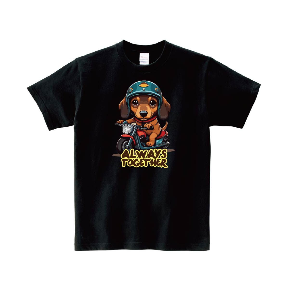 ダックスフントのバイク乗りのかわいいデザインTシャツです。※画像ははめ込み画像となり、実際とは多少異なりますので予めご了承ください。 ※サイズ表をよくご確認の上ご購入ください。 ※受注生産となるため、返品、交換はご遠慮ください。