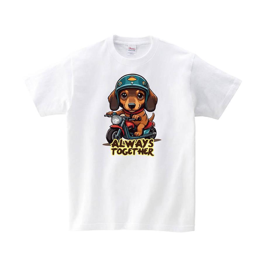 ダックスフントのバイク乗りのかわいいデザインTシャツです。※画像ははめ込み画像となり、実際とは多少異なりますので予めご了承ください。 ※サイズ表をよくご確認の上ご購入ください。 ※受注生産となるため、返品、交換はご遠慮ください。