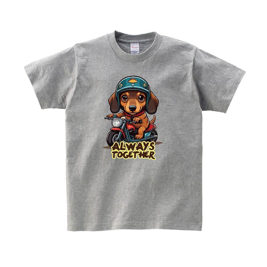 ダックスフントのバイク乗りのかわいいデザインTシャツです。※画像ははめ込み画像となり、実際とは多少異なりますので予めご了承ください。 ※サイズ表をよくご確認の上ご購入ください。 ※受注生産となるため、返品、交換はご遠慮ください。