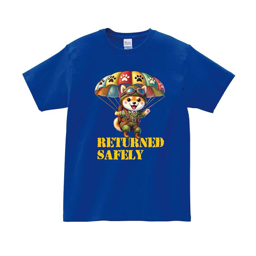かわいらしい柴犬がパラシュートで無事に帰還したイラストをあしらったデザインTシャツです。※画像ははめ込み画像となり、実際とは多少異なりますので予めご了承ください。 ※サイズ表をよくご確認の上ご購入ください。 ※受注生産となるため、返品、交換はご遠慮ください。