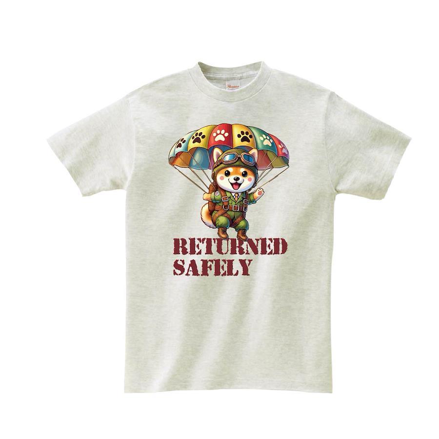 かわいらしい柴犬がパラシュートで無事に帰還したイラストをあしらったデザインTシャツです。※画像ははめ込み画像となり、実際とは多少異なりますので予めご了承ください。 ※サイズ表をよくご確認の上ご購入ください。 ※受注生産となるため、返品、交換はご遠慮ください。