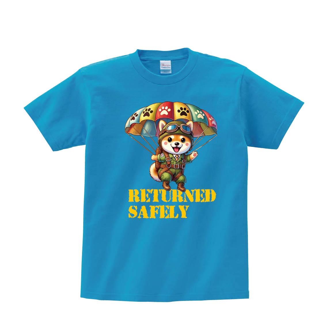かわいらしい柴犬がパラシュートで無事に帰還したイラストをあしらったデザインTシャツです。※画像ははめ込み画像となり、実際とは多少異なりますので予めご了承ください。 ※サイズ表をよくご確認の上ご購入ください。 ※受注生産となるため、返品、交換はご遠慮ください。