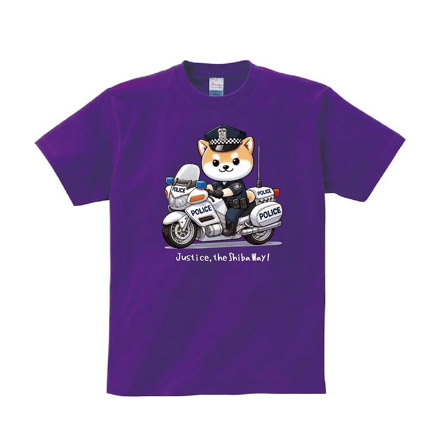 犬のおまわりさん、柴犬の白バイに乗った、かっこつけデザインTシャツです。※画像ははめ込み画像となり、実際とは多少異なりますので予めご了承ください。 ※サイズ表をよくご確認の上ご購入ください。 ※受注生産となるため、返品、交換はご遠慮ください。