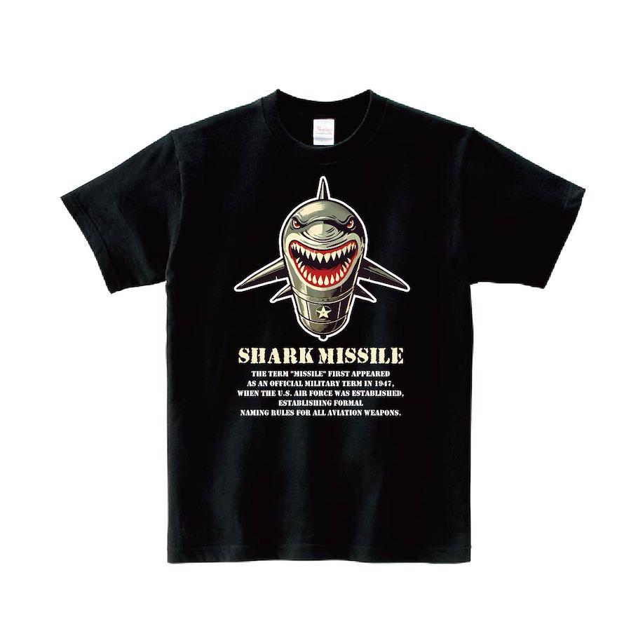 鮫のミサイルキャラクターモチーフTシャツです。※画像ははめ込み画像となり、実際とは多少異なりますので予めご了承ください。 ※サイズ表をよくご確認の上ご購入ください。 ※受注生産となるため、返品、交換はご遠慮ください。