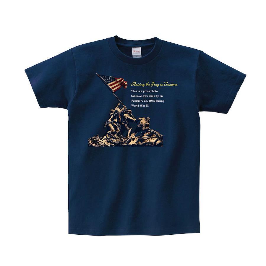 第二次世界大戦中の1945年2月23日に硫黄島で撮影された報道写真のモチーフTシャツです。※画像ははめ込み画像となり、実際とは多少異なりますので予めご了承ください。 ※サイズ表をよくご確認の上ご購入ください。 ※受注生産となるため、返品、交換はご遠慮ください。