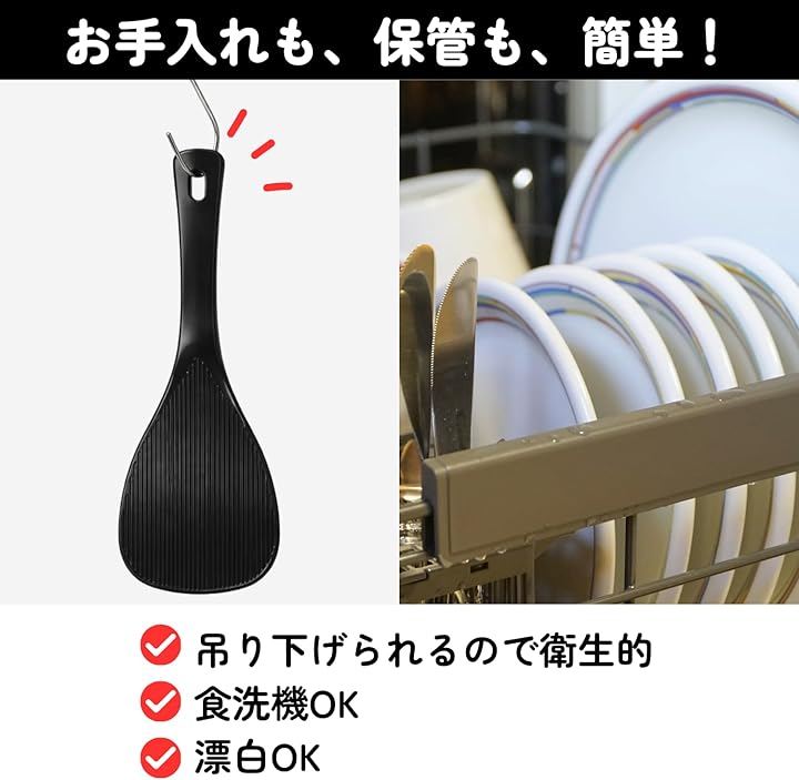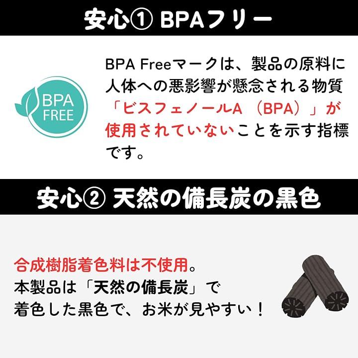 「ご飯がつきにくい設計」 備長炭入り素材とエンボス加工と縦ラインリブにより、べたつきを抑え、盛り付けが快適です。
