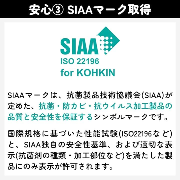 「SIAAマーク取得の抗菌仕様で清潔な製品」 抗菌製品技術協議会(SIAA)が制定した、抗菌・抗ウイルス・防カビ加工製品のシンボルで、国際基準(ISO)に準拠した性能、安全性、適切な表示の3つの基準を満たした製品に付与されるSIAAマーク取得製品です
