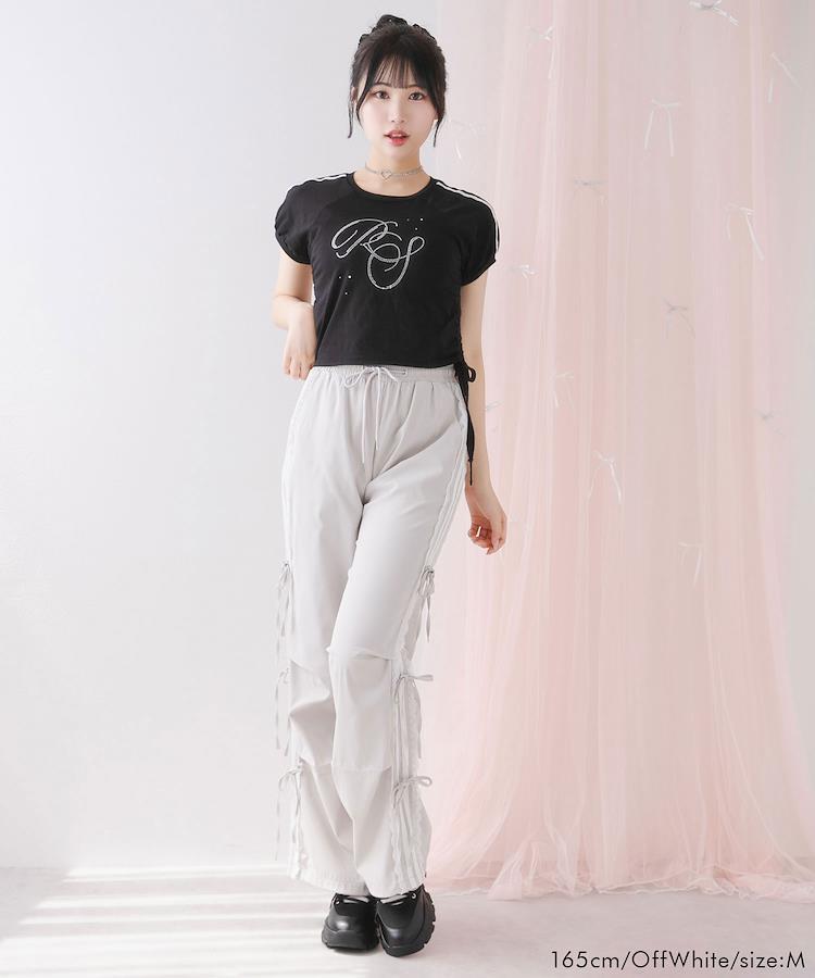 サイドに施された2本ラインやレーステープ、リボンがカジュアル過ぎずガーリーな印象を与えるカーゴパンツ。