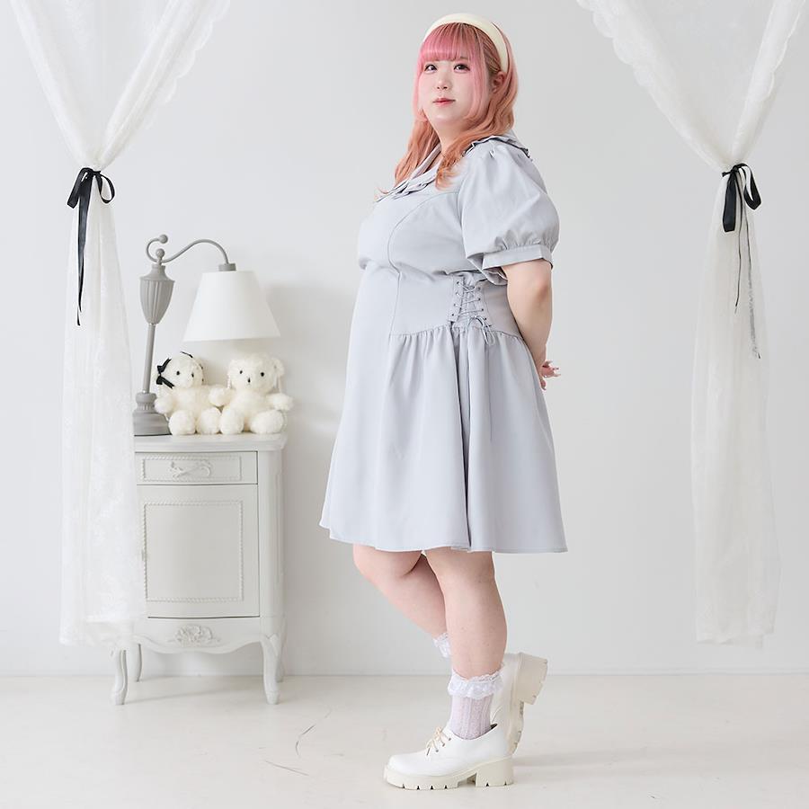 サイドレースアップにスカートのギャザー位置を低くすることで、コルセット感のあるデザインになりスタイルUP効果を狙いました!