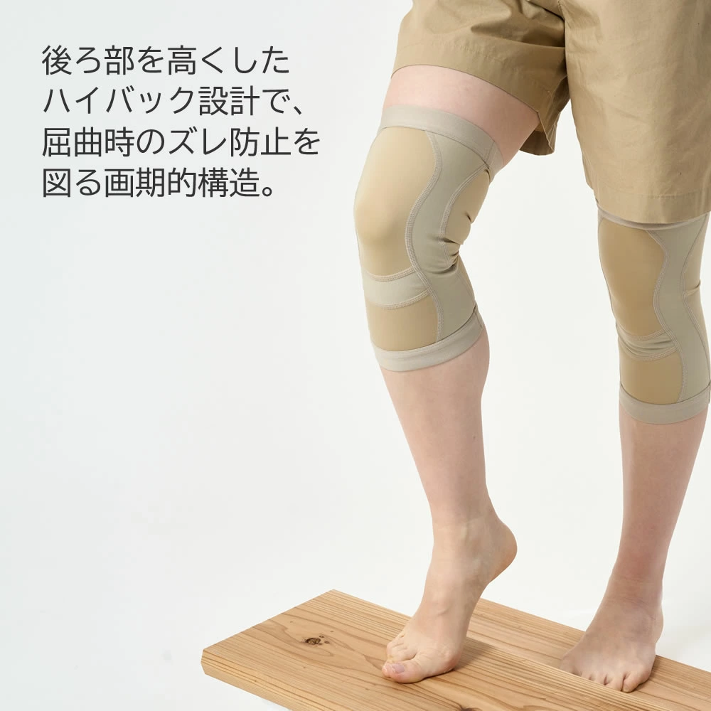 ・ひざの安定性+ずり落ちを軽減した、独自のウェーブラインカット設計(特許取得)・お皿を両サイドと膝下から挟み込むH型のデザイン設計。両サイドと膝下を支えるように挟み込む6枚の生地パターン(伸縮方向を組み合わせた)を流線型ラインステッチで縫製することで屈曲と伸展をスムーズにしてひざのお皿を安定させる。また一定のコンプレッション(圧)を保つことができる。・後ろ部を高くしたハイバック設計で、屈曲時のズレ防止を図る画期的構造。