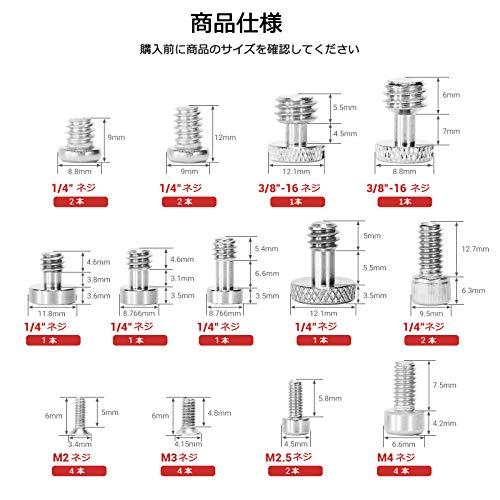 【パッケージ内容】2 x 1/4マイナスネジ;8 x 1/4六角穴付ボルト;2 x 3/8マイナスネジ;4 x M2十字穴付きネジ;4 x M3十字穴付きネジ;2 x M2.5六角穴付ボルト;4 x M4六角穴付ボルト。【適用器材】一部のケージ、プレート、ハンドル、ベースプレート、パイプクランプ、モニターマウント、ロゼットなどの取り付けと取り外しに使用できます。【合計】パッケージに六種類のネジがあり、全部で26本です。【詳細情報】1/4マイナスネジは、一部のケージ、Lプレート、クイックローディングプレートに使用されます。1/4六角穴付ボルトはLプレート、クイックローディングプレート、ベースプレート、ハンドル、パイプクランプ、トッププレート、モニターホルダーなどに使用されます。マイナスネジはクイックローディングプレートとベースプレートに使用されます。M2十字穴付きネジは旧版ロゼットに使用されます。M3十字穴付きネジは新版ロゼットに使用されます。M2.5六角穴付ボルトはケージのサイドロックに使用されます。M4六角穴付ボルトは底プレートにLプレートとサイドプレートをロックするのに使います。?もっと見る