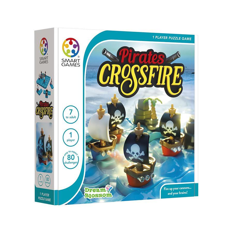 大砲と君の思考力に火を点けろ!SMART GAMESの "パイレーツ クロスファイヤー (Pirates CrossFire)" は、子どもから大人まで楽しめる脳トレボードゲームです。射程距離に敵船を配置し、味方の船をナビゲートして大砲点火! 敵を沈める作戦を立てよう。4つのプレイモードと、だんだん難しくなる80の問題に挑戦できるパズルゲームです。1人でも遊べるので、おうち時間や外出先でも楽しめる知育玩具です。