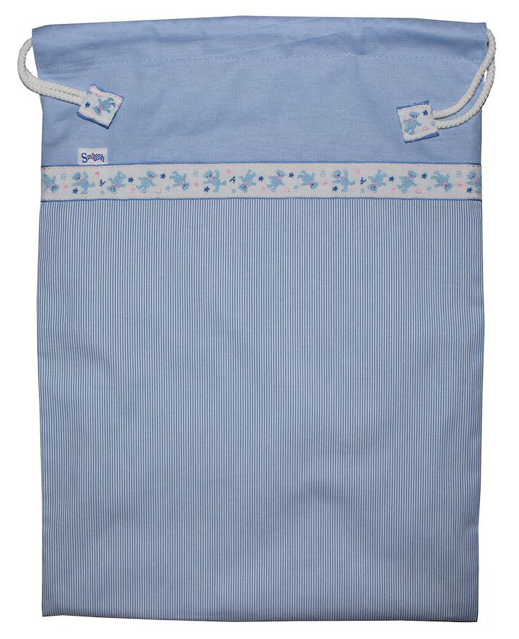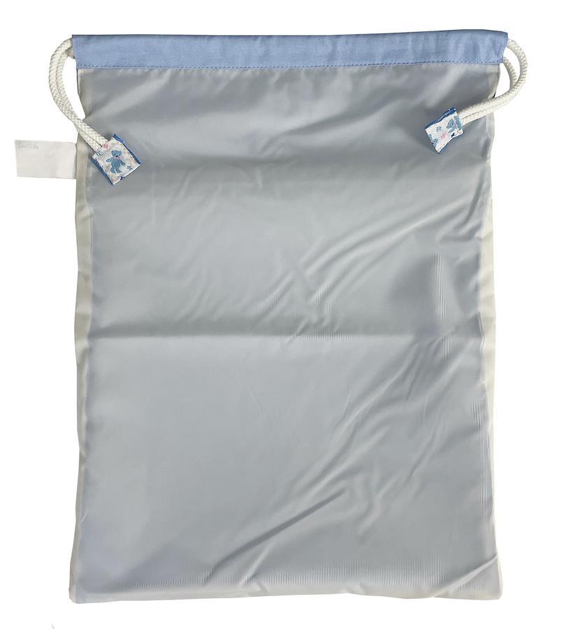 体操服、スモック、エプロンなどがすっぽり入る大きさの巾着タイプのお着替え袋。ナイロン裏地付きの丈夫でしっかりとした二重仕立て。シンプルで上品なデザイン。