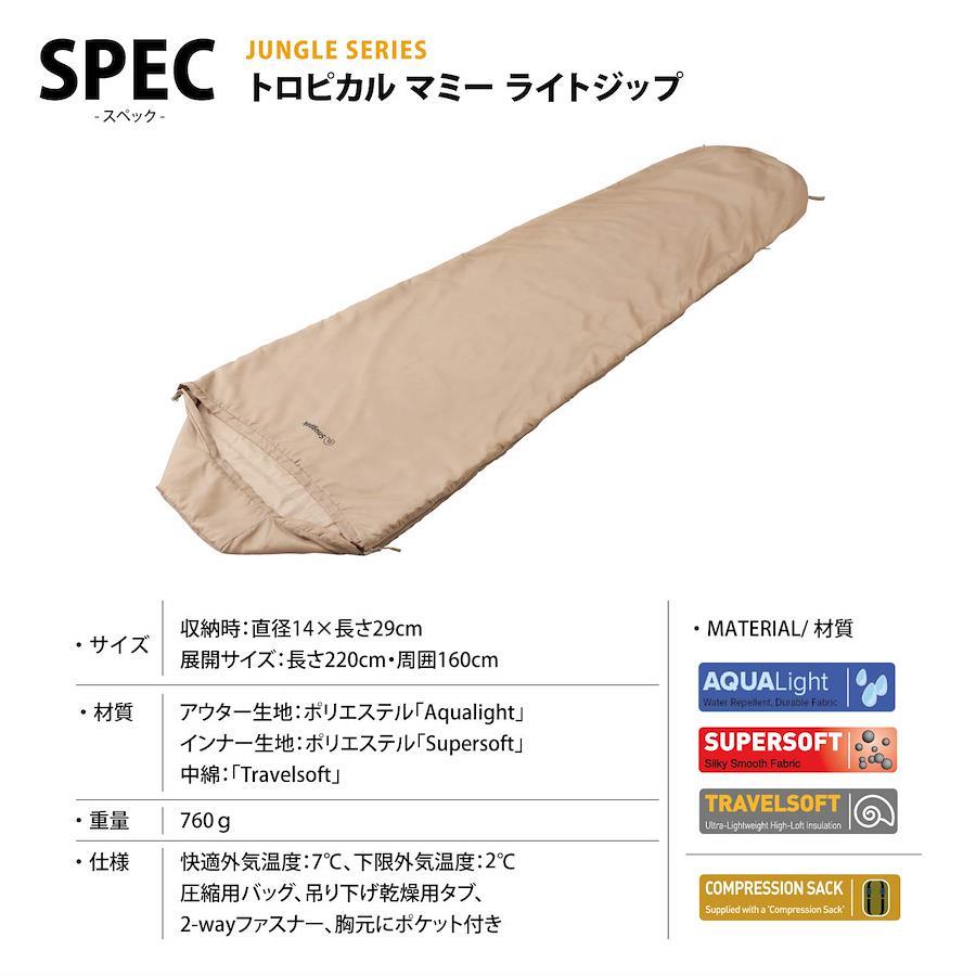 サイズ/収納時 : 直径14×長さ29cm、展開時 : 縦(長さ)220cm・横(周囲)160cm材質/アウター生地 : ポリエステル「Aqualight」インナー生地 : ポリエステル「Supersoft」中綿: ポリエステル「Travelsoft」重量/900g仕様/快適外気温度 : 7℃、下限外気温度2℃、圧縮用バッグ洗濯可/中綿は化学繊維のため丸洗い可能