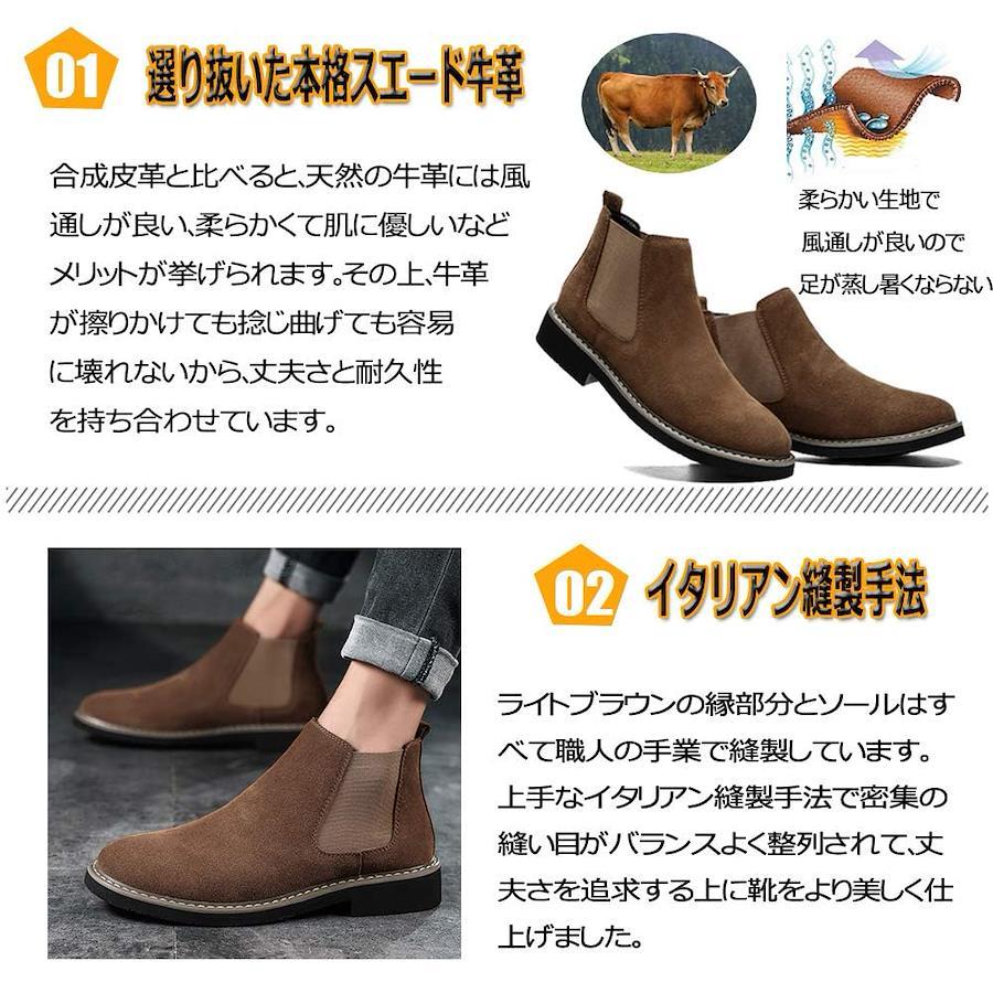 クロージャータイプ レースアップ 【選り抜いた上質な牛革】合成皮革と比べると、天然の牛革には風通しが良い、柔らかくて肌に優しいなどメリットが挙げられます。その上、牛革が擦りかけても捻じ曲げても容易に壊れないから、丈夫さと耐久性を持ち合わせています。【イタリアン縫製手法】ライトブラウンの縁部分とソールはすべて職人の手業で縫製しています。上手なイタリアン縫製手法で密集の縫い目がバランスよく整列されて、丈夫さを追求する上に靴をより美しく仕上げました。【衝撃吸収 ラテックス中敷】高反発素材を全面に採用し、衝撃吸収性が高いです。中敷の厚さは人間工学を基づいて、踵の1.5cmから徐々につま先の0.5cmに変わります。弾力性に富むラテックスにより、それぞれの体重に応じて振動を分散したり吸収したりできて、歩く時の履き心地を増します。防臭加工により、嫌なニオイを抑えることができます。【テクスチャゴムソール】ソール部は車のタイヤと同じ素材であるゴムで作りました。靭性が良くて摩擦にも強いです。滑り止め用の溝形模様が付いているので、濡れた床でも気楽に歩けます。【シンプルかつ上品】シンプルなデザインと、落ち着いた雰囲気の上質な大人のコーデを演出する本革スエード カジュアルシューズ。多彩なシーンで活躍する汎用性の高いスエード靴を探している方におすすめのモデルです。