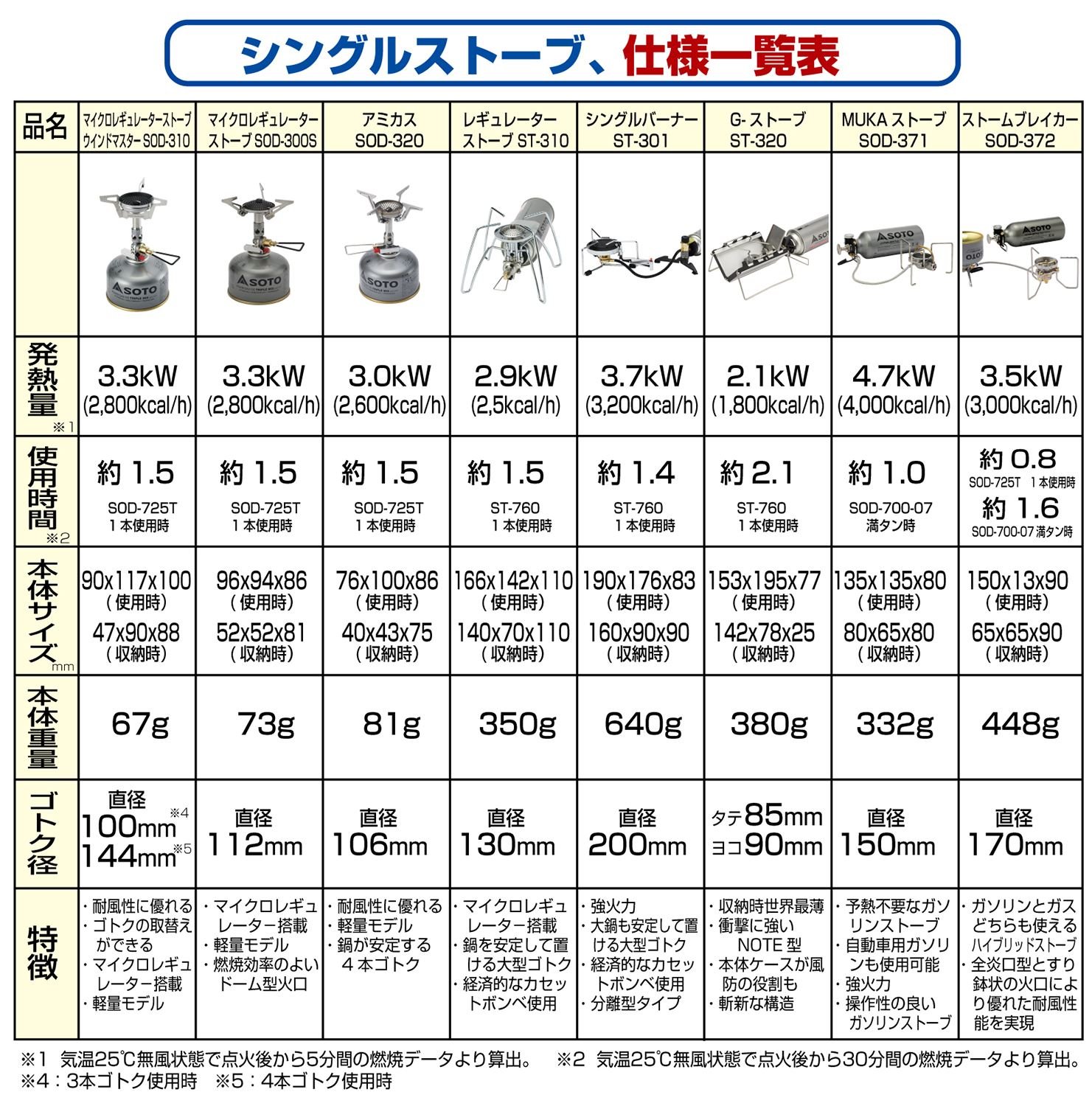 本体サイズ:幅19×奥行17.6×高さ8.3cm(収納時)本体重量:690g収納時サイズ:幅16×奥行10×高さ9cm発熱量:3.7kw(3200kcal/h) (ST-760使用時) ※気温25度無風状態で点火後から5分間の燃焼データより算出使用時間:1.4時間(ST-760 1本使用時) ※気温25度無風状態で点火後から30分間の燃焼データより算出材質:バーナー=ステンレス(セラミック塗装)、スタビライザー・器具栓つまみ=樹脂原産国:日本