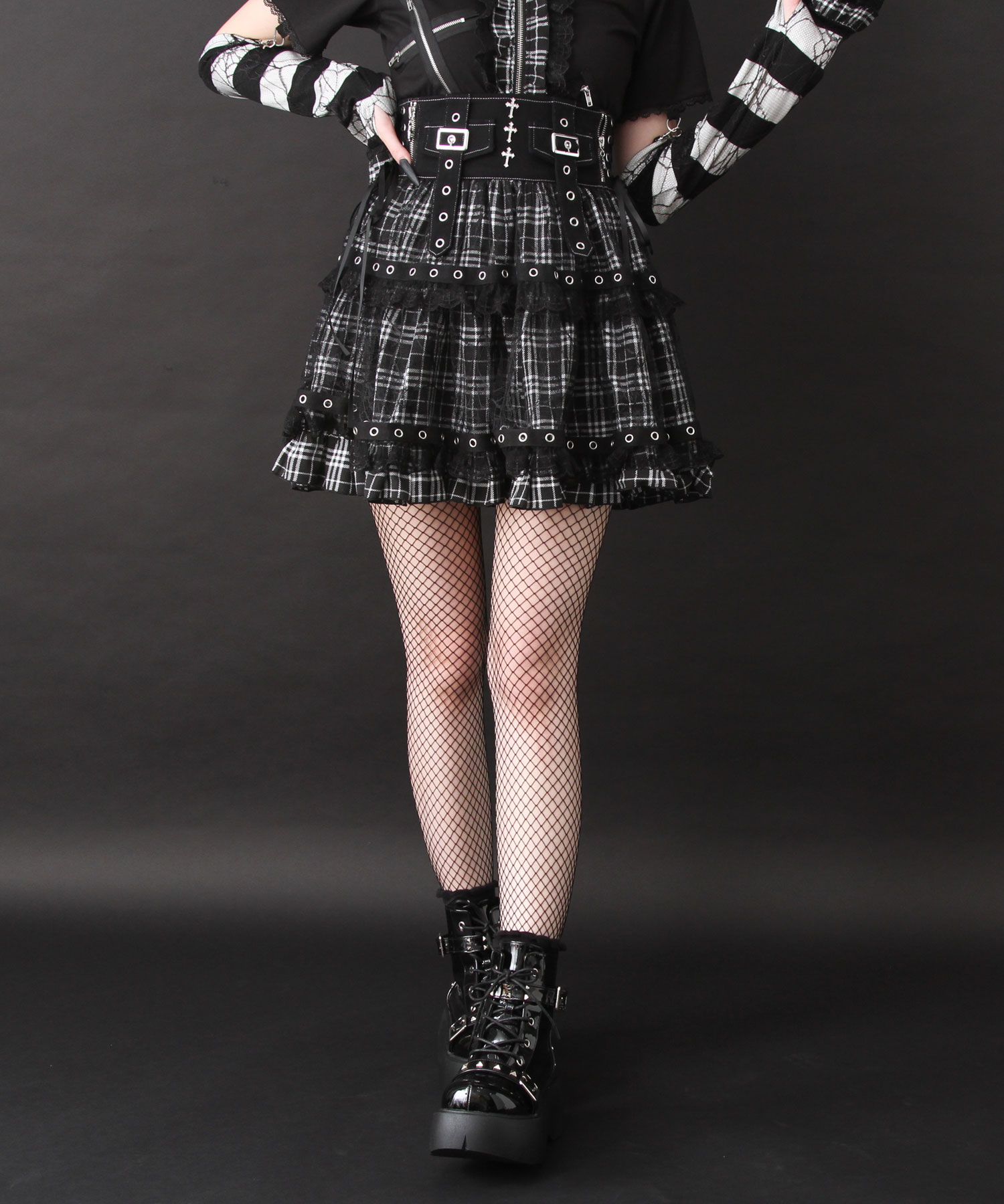 ゴシック×サブカルを融合した十字架クモレースチェックティアード風スカートの登場です。【デザイン】ウエスト部分伸縮性のあるデニム生地を採用し、フィット感抜群&動きやすさ◎ウエスト中央には十字架モチーフのビジューを3つ並べ、華やかながらも暗めのトーンで引き締めファスナーの引き手にはキラキラ光るドクロチャームをあしらい、スナップをひとつ上の個性派にポイントに効かせた配色ステッチで、細部にもこだわりを両サイドにはレースアップデザインを施し、コーデに合わせてアジャスト可能メタルバックル付きのベルトを2本垂らして、レイヤード感&サブカルテイストを演出スカート部分ベースにあしらったチェック生地の上に、繊細なクモの巣モチーフレースを重ねてアクセント十字架柄のレースフリルを二段に配し、ボリュームと陰影をプラスフリル上部にはシルバーのハトメテープをあしらい、ヴィンテージライクかつハードな印象に【素材】しっかりとした素材になっています。ウエスト後ゴムとファスナーで着脱可能【コーディネート】個性的なディテールを詰め込んだ一着で、コーディネートにひとさじのダークロマンティックをプラス。裾にかけて広がるティアード風シルエットが、歩くたびに揺れてドラマティック。ゴスロリ、パンク、サブカル地雷まで、幅広いスタイルにマッチする万能アイテムです。《透け感》なし 《生地の厚さ》普通 《裏地》なし《生産国》中国