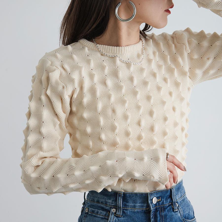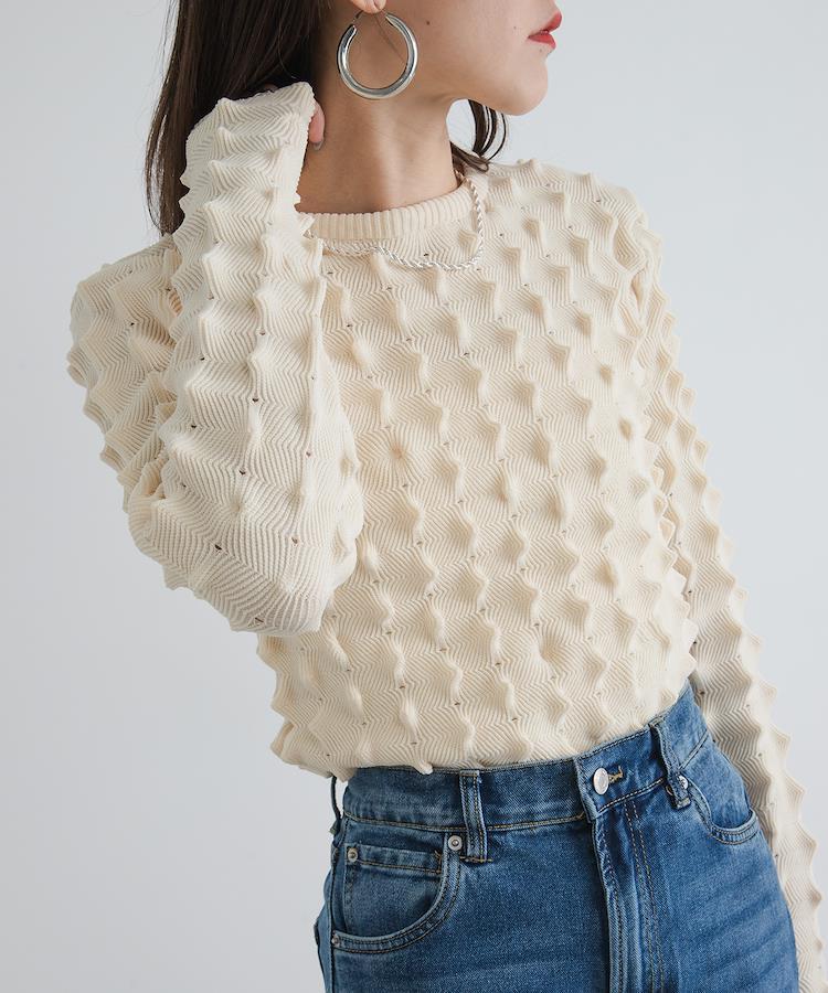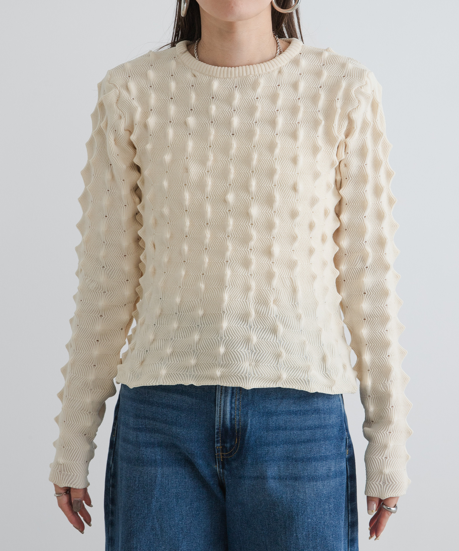 【Design】トゲトゲとした立体的な編地がキャッチーなトップス。