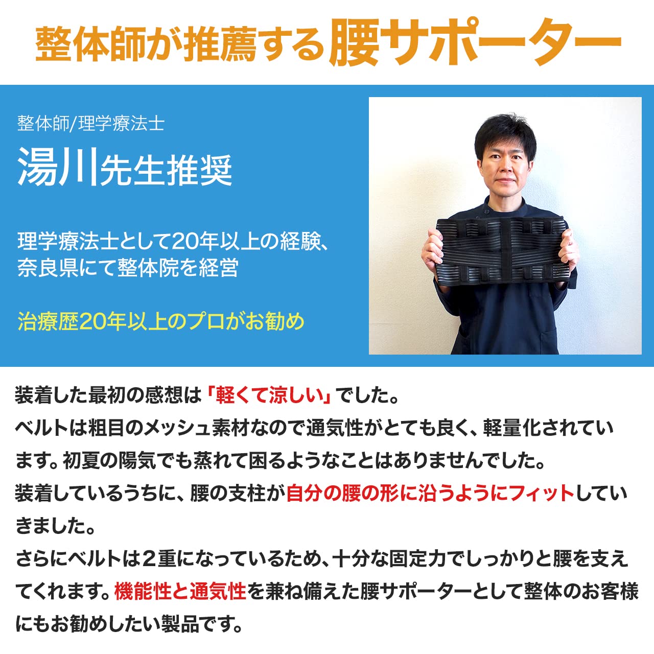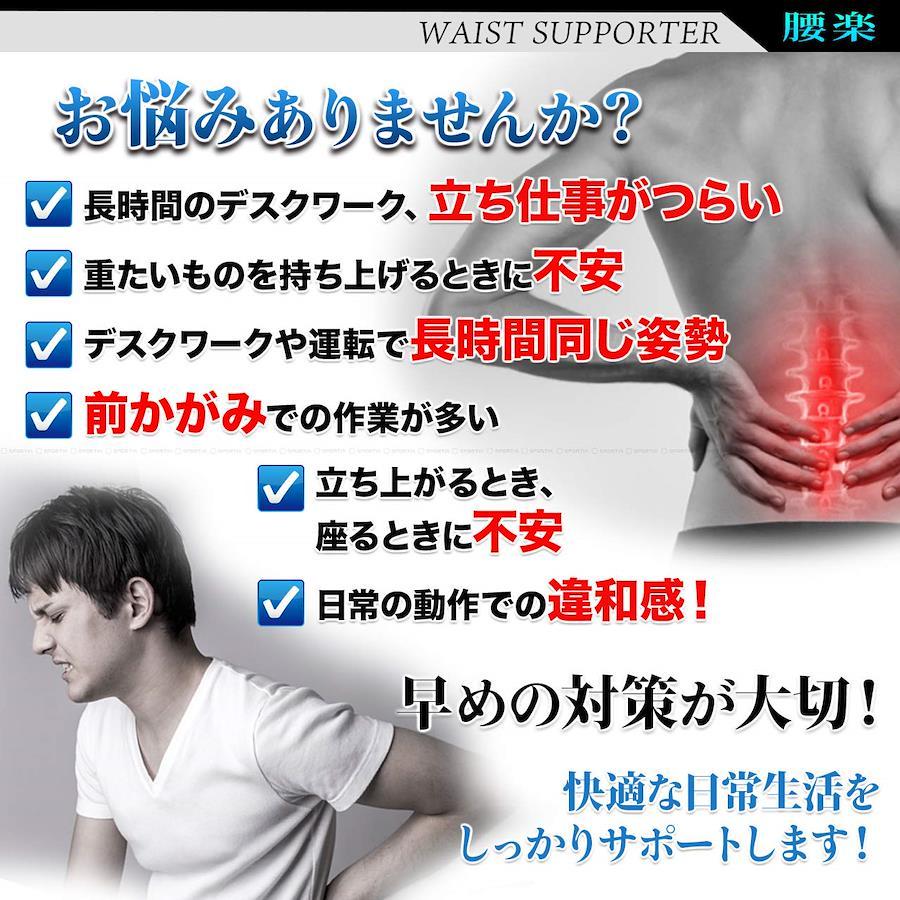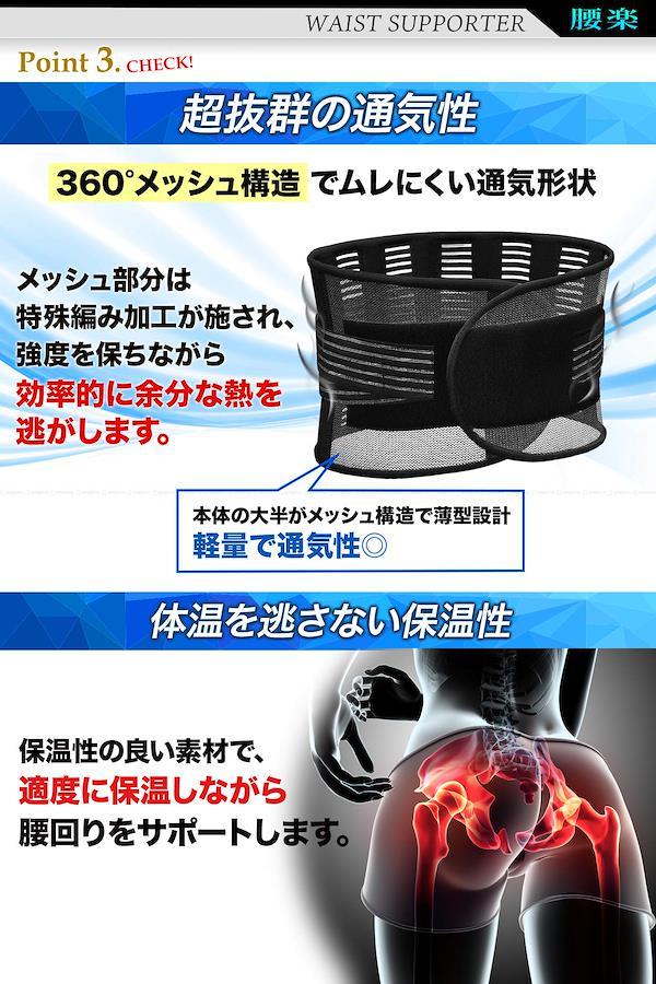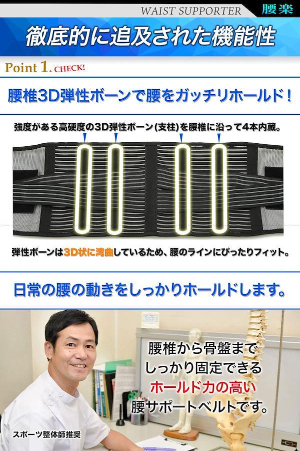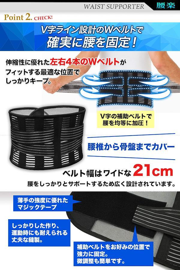 腰をしっかり支える腰用サポートベルト。【治療歴20年以上の整体師/理学療法士湯川先生推奨】二重ベルトと背面の支柱で強力固定。適度な弾力の特殊弾性ボーンを背面に4本内蔵した腰サポーター。腰椎から骨盤にかけてしっかりと腰をサポートします。 軽量で通気性に優れた薄手のメッシュ素材のためオールシーズン快適にご使用いただけます。伸縮素材の二段式補助ベルトによって作業時やスポーツ時でもずれにくく、着用したまま簡単に締め付け加減を調節できます。 伸縮素材で腰にフィット!腰サポートベルトは腹圧を高め姿勢補正や、お腹引き締め、シェイプアップにも◎腰回りのサポートはもちろん、骨盤ベルトとしても使用可能。 腰を酷使するお仕事、介護や看護、長時間の立ち仕事、座り仕事、デスクワーク、タクシー運転手やトラックドライバーの方、スポーツをされている方にもおすすめです。 着用サイズ S:ウエスト約60~76cm M:ウエスト約70~86cm L:ウエスト約80~96cm XL:ウエスト約90~103cm XXL:ウエスト約94~115cm / 幅約21cm / メンズ/レディース兼用/男女兼用・装着手順のイラスト入り説明書付きです。