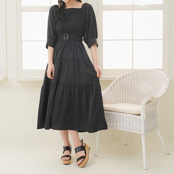 きゅっとウエストをしめれるベルトとスクエアネックラインがスタイルアップ効果を後押し。